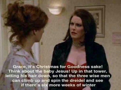 On Sunday I found myself again explaining faith traditions to curious elevator passengers as we rode 5 floors together while I held Hanukkah Gelt, pink rosaries, an Advent devotional book, and a Diet Coke. And by that point in my week, I felt about as confused as Karen Walker when she said, “Grace, it’s Christmas for Goodness sake! Think about the baby Jesus! Up in that tower, letting his hair hang down, so that the three wise men can climb up and spin the Dreidel and see if there’s six more weeks of winter.”
