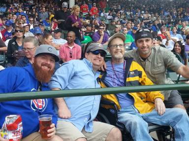 So yesterday Charles and his friends packed up the wheelchair and some extra pain meds from the Hospice nurses, and took Richard to Wrigley Field for the Cubs game. They had wheelchair accessible tickets behind home plate for their day at the ballpark and spent it doing what they loved most- watching baseball, together, in one of their favorite venues. Charles’ friends took some priceless pictures of them sitting together at the crowded stadium on what was no doubt a sacred day for them both. And while I doubt the crowds in the stands behind them know anything about their sacred day, I love that there is a crowd behind them in the pictures because I believe that’s who we’re called to be: the visible, tangible crowd of love.