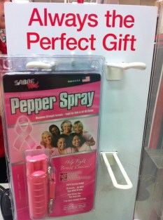 I was reaching for my wallet when I noticed the display of pepper spray by the register. Breast cancer fundraiser pepper spray to be precise. And the sign above said display read, “Always the perfect gift.”